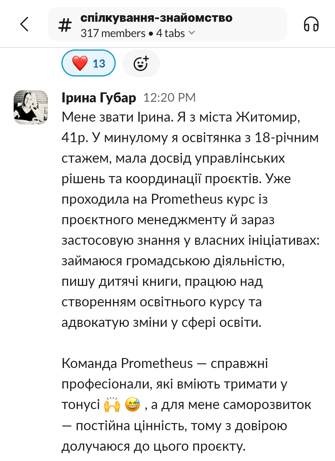 Я безмежно вдячна Галині Разумій та всій команді Prometheus за цей потужний поштовх, нові навички, відновлену впевненість та щоденну турботу, яка робила цей шлях особливим. Це інвестиція в себе, яка дає реальні плоди — від відпрацьованих навичок співбесіди до чіткого розуміння, куди і навіщо рухатись, і як зберегти себе в професійному руслі.