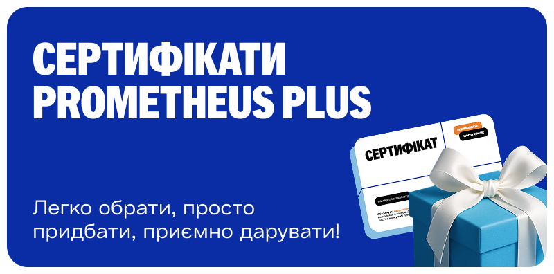 Сертифікати Prometheus PLUS — це простий спосіб подарувати друзям, рідним або колегам доступ до знань, нових навичок і кар’єрного зростання.